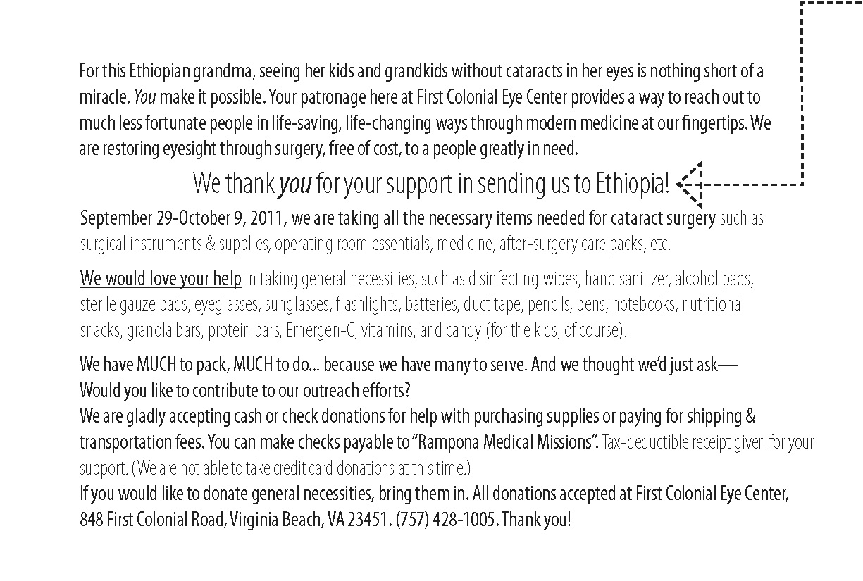 Materials informing of medical trip for doctor and staff at First Colonial Eye Center (FCEC). Great opportunity to thank the patients of Dr.Rampona for their visits to FCEC, and for their donations for the trip, making it possible to take so much equipment and medicine.